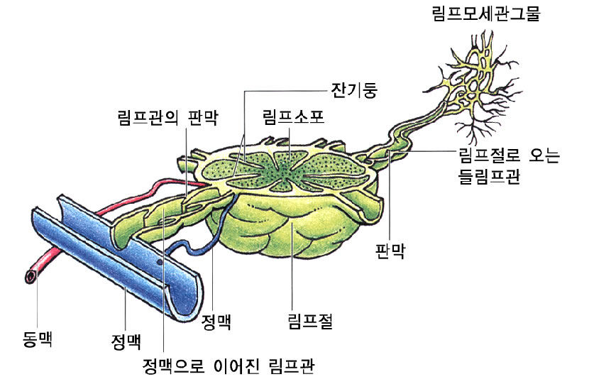 각 림프 모세관을 통해 모아진 림프액은 들림프관(afferent lymphatic vessels)을 따라 여러 림프절로 모이게 된다. 림프절에서는 림프액이 이른바 림프구로 가득찬 1차종자결절(primary germinal nodule)과 큰포식세포로 가득 찬 동굴그물을 거치게 되어서, 나쁜 병균이나 기타 이물이 면역작용을 받게되어 인체에 무해하도록 정화되어진다. 이렇게 정화된 림프액은 다시 날림프관(efferent lymphatic vessel)을 통해 다른 림프절이나 림프관으로 이동되어 결국은 가슴관(thoracic ducts)을 통해 정맥과 만나 심장으로 보내어지게 된다.