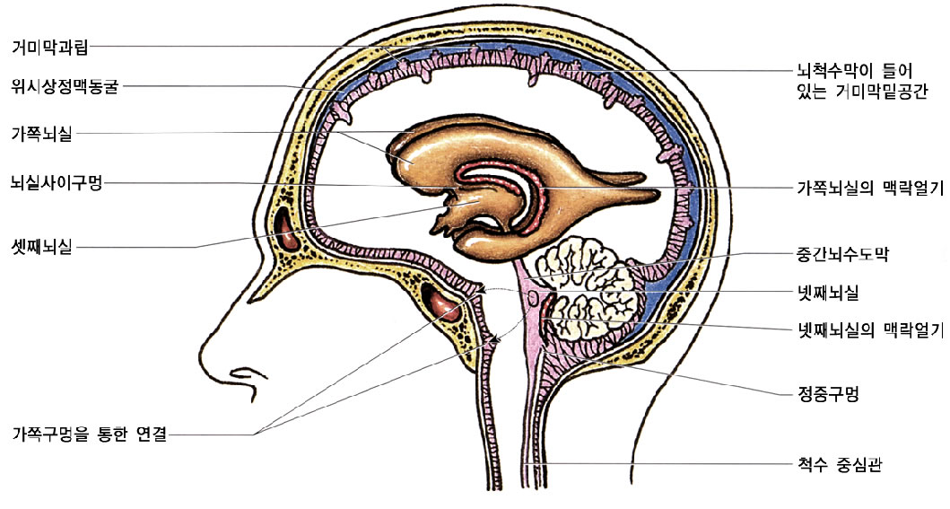 거미막밑공간과 뇌실을 채우고 있으면서 뇌와 척수를 쌓고 있는 맑은 액체를 뇌척수액이라 한다. 거미막밑공간이란 3개의 층(밖에서 부터 경질막, 거미막, 유막)으로 이루어진 뇌막 중에서 2번째 층에 해당하는 거미막의 아래의 공간으로 가장 밑에 있는 뇌막인 유막의 위에 존재하는 공간이다. 뇌실이란 뇌속에 존재하는 공간으로 그 속에는 뇌실액으로 채워져 있다. 뇌와 척수는 고체이고 이것들을 둘러쌓는 뇌척수액은 액체이므로 뇌, 척수는 뇌척수액속에 떠있는 결과가 된다. 이는 외부의 충격으로부터 뇌와 척수를 보호하는데 유용하다.