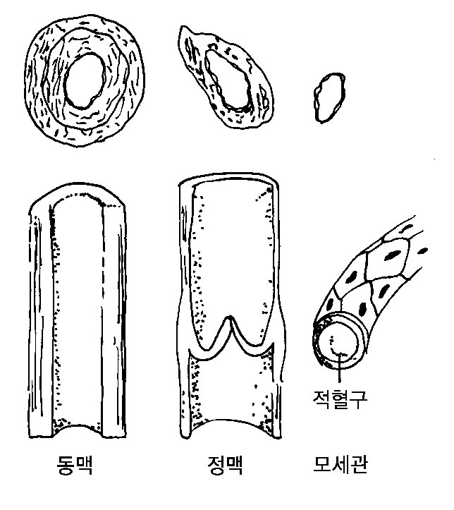 혈액이 다니는 길. 동맥, 모세혈관, 정맥으로 구성된다. 동맥은 심장에서 나가는 피를 운반하는 혈관. 이것은 심장에서 나가는 피를 운반하는 혈관이며 심장에서 직접 많은 압력을 받아야 하므로 많은 연조직과 탄성섬유로 이루어져 있다. 이것은 크기와 그 현미경적 구조에 따라 다음과 같이 나눈다. 대동맥(왼심실에서 직접 나오는 동맥. 온몸의 혈액 순환의 줄기역할을 한다), 동맥(대동맥에서 분지를 낸 중간 크기의 동맥), 세동맥(동맥에서 분지를 낸 작은 동맥을 말한다)으로 나눈다.