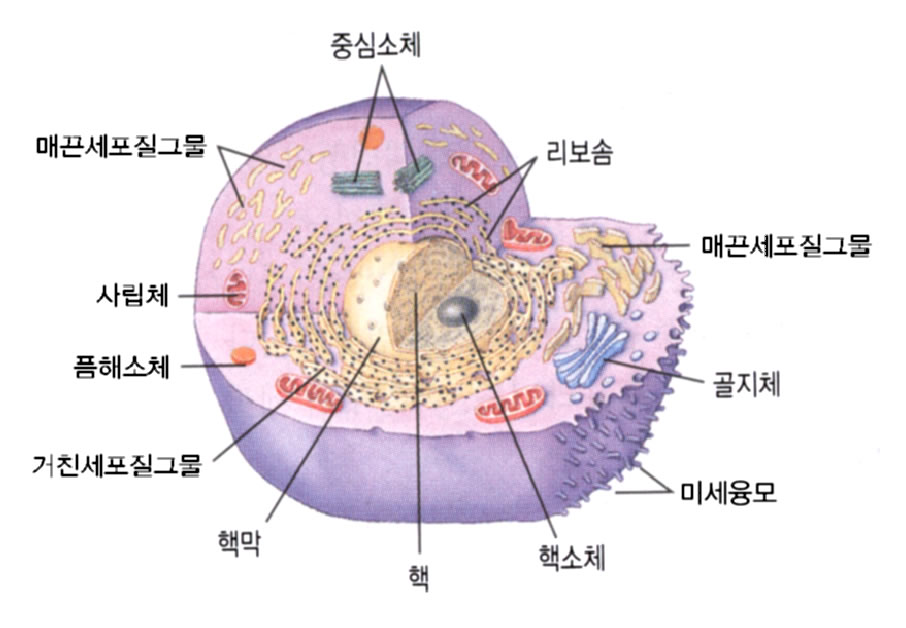 3.리보솜-단백질을 합성하는 역할을 하는 곳이다.이것은 세포질에 존재하는 자유리보솜과 과립형질내세망에 부착이 되어 존재하는 부착리보솜의 두 가지로 나눈다. 자유리보솜은 주로 세포내에서 필요한 단백질을 만드는 역할을 하고 부착리보솜은 세포밖으로 분비할 단백질을 만드는 역할을 한다.