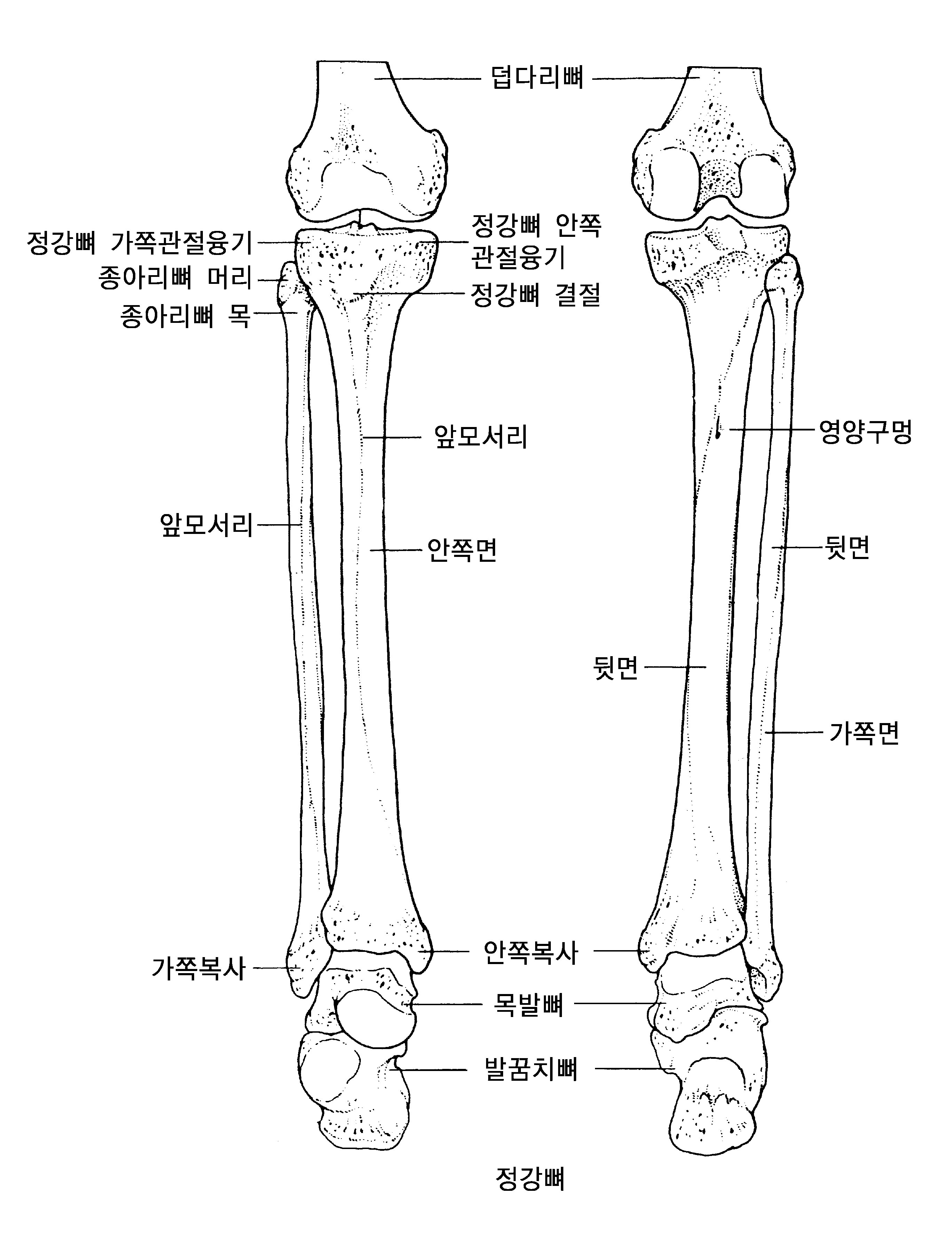 넙다리뼈를 이루는 뼈. 길이 30~33cm의 관 모양의 뼈이며, 인체골격 중에서 넙다리뼈 다음으로 크다. 넙다리뼈로서의 역할은 주로 정강뼈가 하고, 종아리뼈는 종속적이다. 정강뼈는 체표에서 모두 만져진다. 상단은 굵고 좌우로 퍼져 있으며, 약간 오목한 상관절면은 넙다리뼈의 하단면과 함께 무릎관절을 구성한다. 상단 바깥쪽에 비골의 머리부분과 접하는 종아리뼈관절면이 있다. 중간부분의 정강뼈몸통은 정강이에 해당하는 곳으로, 삼각기둥 모양이며, 세 개 모서리와 세 개 면이 있다. 앞모서리가 가장 날카로우며 손으로 만질 수 있고, 이곳을 얻어맞으면 매우 아프다. 앞모서리 위쪽 끝에 정강뼈거친면이 있는데, 이는 무릎인대의 부착부로, 무릎반사에서 두드리는 자리이다.