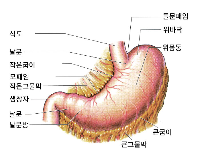 식도와 작은창자 사이의 소화기관으로서 들문, 바닥, 몸통, 날문방, 날문의 부분으로 구성된다. 내부에는 점막 주름이 있다. 주머니 모양으로 긴쪽의 모퉁이를 큰굽이, 짧은쪽의 모퉁이를 작은굽이라 부른다. 위에 있는 위샘은 염산을 분비하는 벽세포, 점액을 분비하는 점액목세포, 펩신을 분비하는 주세포 등으로 구성된다. 기능은 기계적인 소화작용 및 위산이 분비되어 살균작용을 하고 펩신이 분비되어 단백질을 분해한다.